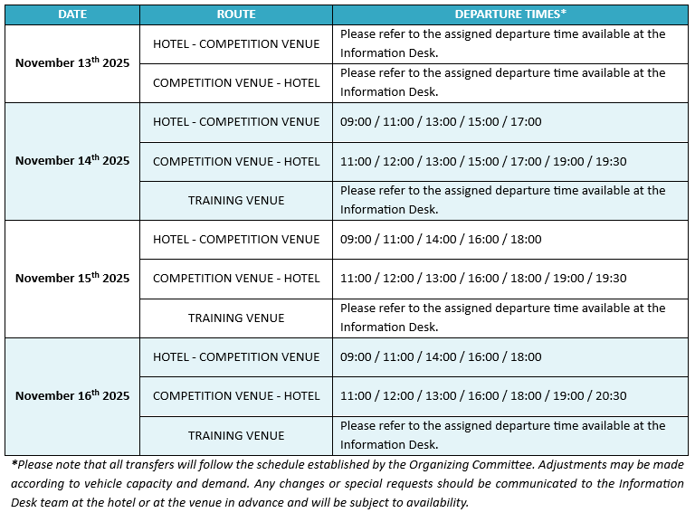 Shuttle service will be provided for teams departing from the Hotel to the Training Venue and the Competition Venue. Please find in the following table the available routes and departure times: